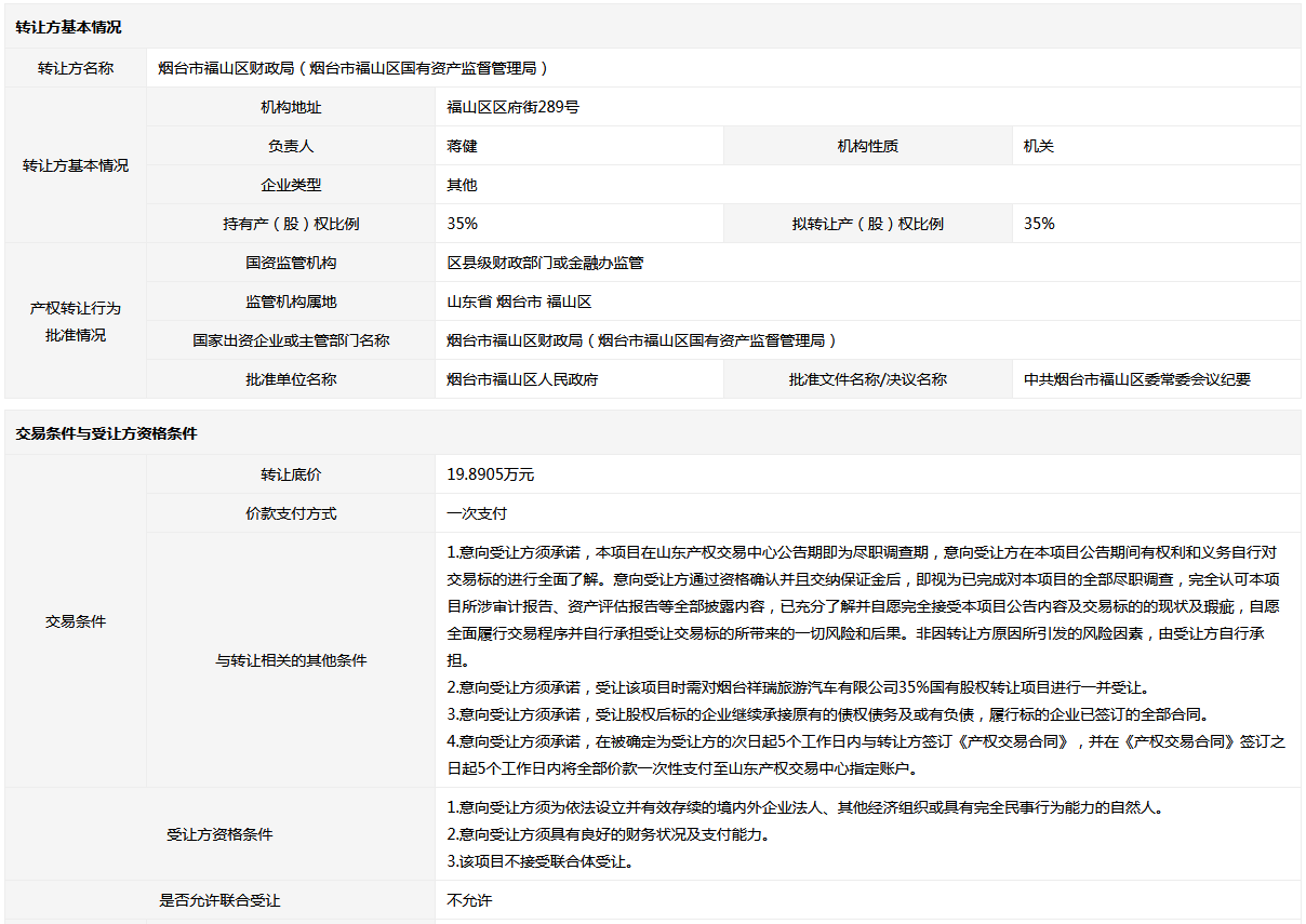 - 轉(zhuǎn)讓方: 煙臺(tái)市福山區(qū)財(cái)政局(煙臺(tái)市福山區(qū)國(guó)有資產(chǎn)監(jiān)督管理局)