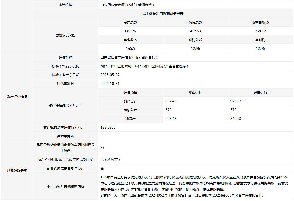 轉(zhuǎn)讓方: 煙臺市福山區(qū)財政局(煙臺市福山區(qū)國有資產(chǎn)監(jiān)督管理局)